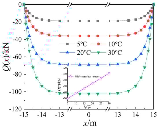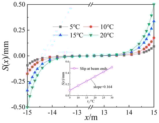 To examine the influence of temperature variation on the interfacial slip and shear force of the composite beam’s concrete slab, a value of δ = 0.1 is selected. The temperature (t3) at the top of the concrete bridge panel is varied between 5 °C, 10 °C, 15 °C, and 20 °C, and the corresponding interfacial slip and shear force are calculated accordingly, as illustrated in Figure 10 and Figure 11.