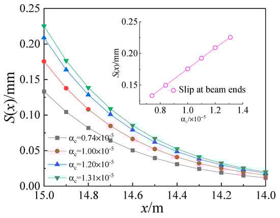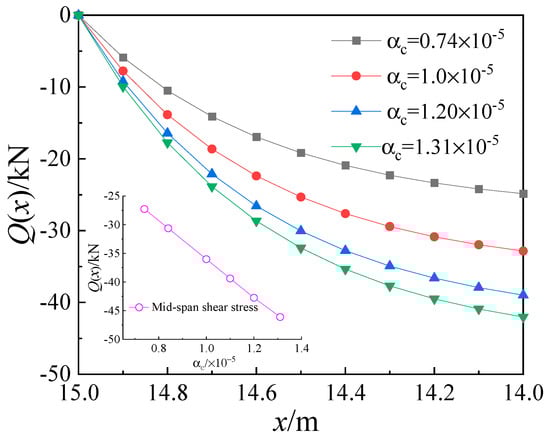 Concrete, being a composite material, exhibits a linear expansion coefficient influenced by factors such as aggregate type and temperature. According to the literature [], the linear expansion coefficient (αc) of concrete typically ranges from 0.74 × 10−5 to 1.31 × 10−5. To assess the impact of concrete’s linear expansion coefficient on temperature, we selected a δ value of 0.1 and considered αc values of 0.74 × 10−5, 1.00 × 10−5, 1.20 × 10−5, and 1.31 × 10−5, respectively. Subsequently, we calculated the interface slip and interface shear of composite beams based on these values. The calculation results are presented in Figure 12 and Figure 13.