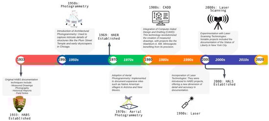 HDP’s roadmap of adopting modern techniques, as illustrated in Figure 1, is an excellent example of how digital technologies have advanced in the field of heritage documentation. Starting in the 1950s, HDP integrated photogrammetry into its documentation [] to record historical structures with enhanced detail. By the 1970s, aerial photogrammetry expanded its scope to larger sites, including Native American villages in Arizona and New Mexico []. The 1980s saw the adoption of CAD for precise drawings, which significantly improved documentation accuracy []. The 1990s introduced laser technologies for enhancing measurement precision [], and the 2000s marked a major shift with laser scanning technologies for 3D documentation, exemplified by the Statue of Liberty project [].