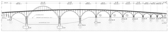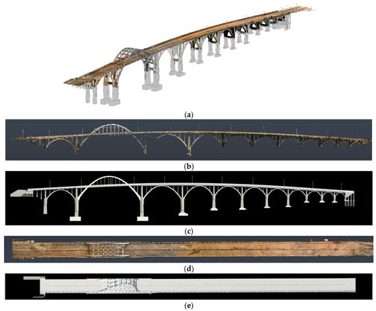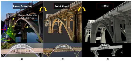 Heritage engineering structures, like bridges, stand as a testament to historical and cultural narratives and the advancements in engineering and architecture over the ages. Often representing significant historical events and technological milestones, these structures impose documentation and preservation for future generations to study, interpret, understand, and appreciate. The conservation of heritage bridges is critically dependent on accurately documenting their current state []. However, the documentation of heritage bridges presents unique challenges. Traditional methods mainly relied on manual measurements, hand-drawn sketches, and photography, which, while valuable, often fall short of capturing the intricate details in the required precision [,] and the full scope of these structures. These techniques are invasive, posing risks to the physical condition of the often delicate historical sites [,,]. The complexity of the design of the bridges, combined with their historical significance, requires a documentation approach that is comprehensive and respectful of the structure’s integrity [].