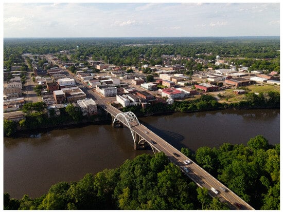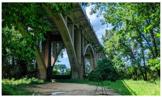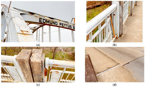 The Edmund Pettus Bridge (EPB), a significant landmark in American history and an example of early 20th-century engineering, spans the Alabama River in Selma, Alabama (Figure 3). Constructed from 1938 to 1940, the bridge was named after Edmund Pettus (1821–1907), a Confederate general who later became a US Senator and a figure deeply embedded in the racial hierarchy of the Antebellum period. It is a complex symbol of historical oppression and the fight for African American civil rights []. Designed by a Selma-born engineer, Henson Stephenson (1897–1978), the bridge’s architectural style is characteristic of its era, featuring a steel through-arch with concrete open-spandrel arches. It stretches 1248 feet and 6 inches long (380.5 m), navigating significant topographical changes along its path. The bridge’s unique structural design, including its asymmetrical arches and decorative elements, showcases the engineering achievements of the time. However, the only substantial change since its construction was replacing its original green paint with a cool gray in the early 1980s []. Beyond its architectural significance, the Edmund Pettus Bridge is marked by its role in the American Civil Rights Movement. It was the site of “Bloody Sunday” on 7 March 1965, a pivotal event where peaceful civil rights demonstrators were violently confronted by law enforcement. This event was a critical moment in the Selma Voting Rights Movement, leading to the passage of the Civil Rights Act in 1965. The bridge’s dual symbolism is further highlighted by its inclusion in the Selma to Montgomery National Historic Trail, a testimony to its role in the Civil Rights struggle. The bridge was declared a National Historic Landmark (NHL) on 27 February 2013.