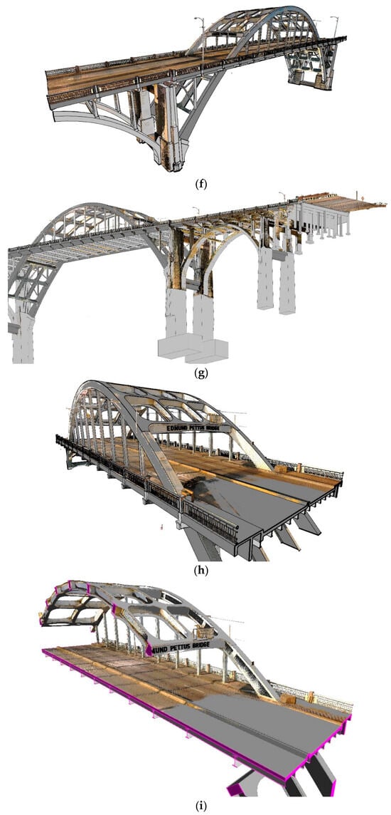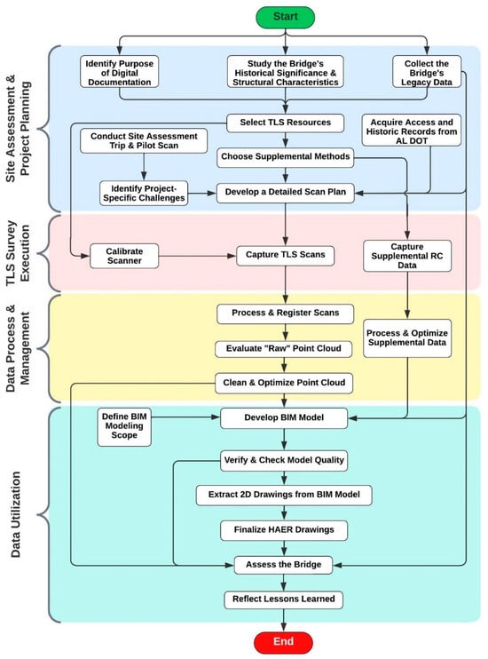 The inclusion of these modern technologies represents a new era in the documentation of heritage bridges. They offer greater accuracy and detail in the recording process and provide a dynamic platform for the analysis, conservation, and sharing of heritage data. As these technologies continue to evolve and become more affordable, it is expected that their application in heritage preservation will become more accessible, ensuring that invaluable cultural landmarks are documented and preserved for future generations with unprecedented fidelity and care. The aim of this study is to illustrate a novel framework of integrating TLS and BIM, along with several other RC technologies, to create detailed, accurate, and non-intrusive digital records of heritage bridges, using the Edmund Pettus Bridge (EPB) as a focal case study. The EPB, located in the city of Selma, Alabama, USA, as a symbol of the American Civil Rights Movement and a marvel of engineering in its days, offers a rich context for exploring the capabilities of modern documentation technologies.