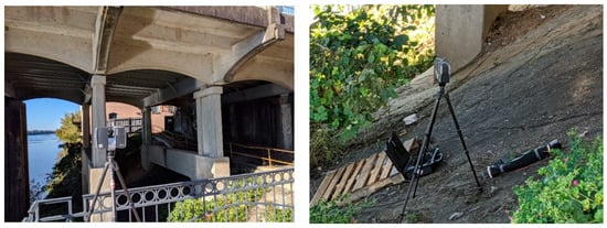 - Preliminary Site Visit and Pilot Scans: This site visit focused on the north approach ramp and Span-1 on the city of Selma side of the bridge. Pilot scans using the FARO X330 laser scanner were also performed (Figure 6) to evaluate the equipment’s effectiveness in the bridge’s environment and validate scanning strategies.