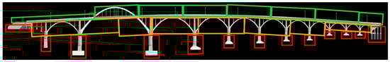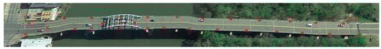 To complement TLS, several other RC technologies were employed for a more comprehensive data acquisition. SfM captured complex details and surface textures to enhance the geometric data from TLS, especially in hard-to-reach areas. Matterport 360-degree photography technology offered interactive panoramic views, aiding in the visualization of surface details for BIM model development [,]. UAVs equipped with high-resolution cameras provided aerial perspectives and access to challenging sections, such as the bridge’s arch, and spans over the river. Additionally, UAV-based infrared photography was instrumental in identifying hidden structural vulnerabilities, like moisture intrusion, which was crucial for assessing the bridge’s condition.
