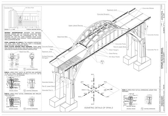 The documentation for the EPB, as a part of an effort for developing a Historic Structure Report (HSR) of this historically significant structure, aimed to thoroughly record and archive the bridge’s existing condition to preserve its historical and architectural legacy for future generations. The two primary documentation outcomes included a BIM model and a set of HAER drawings. The BIM model served multiple purposes: it aided in the preservation efforts by providing a precise representation of the bridge’s current state, and it also formed the basis for the development of the HAER drawings. The HAER drawing set, the second crucial outcome of the project, provided a detailed architectural and engineering record of the bridge.