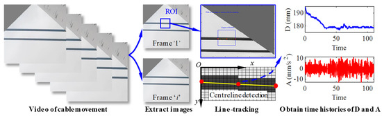 A dynamic-displacement measurement method for the cable is proposed, based on the alignment recognition method, as shown in Figure 1. D and A denote the deformation and acceleration, respectively. The calculated acceleration is used for identifying the modal parameters of the cable and subsequently calculating the cable force using the frequency method. The cable images captured by portable image-acquisition equipment are color images containing many interfering pieces of information. Initially, it is essential to remove any interference and identify the region of interest (ROI). The selected color images must then be converted to grayscale to acquire their grayscale histograms [30]. Given that the measurement of cable dynamic displacement typically necessitates only a brief segment of straight cable, the images are consequently cropped to include this specific section. To enhance the accuracy of the cable dynamic-displacement image recognition, the captured cable images should meet the following three conditions [31]: