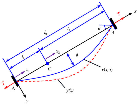 Theoretical derivations for the relationship between cable force and natural frequency were performed considering the effects of bending stiffness, boundary conditions, and concentrated mass on the dynamic performance of stay cables. It is assumed that the cable mass is uniformly distributed along the axial direction. The material is in the elastic stage, and the effects of rotational moment inertia, shear deformation, and sag are neglected. Treating the cable segment as a beam element capable of resisting bending, the dynamic equation is established. Figure 2 shows the schematic of cable vibration considering flexural rigidity, and the dynamic vibration equation of the cable element can be expressed as [37]: