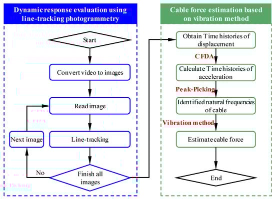 A fast cable-force measurement method is proposed based on digital image processing and a cable-force mechanics model, which can achieve real-time, non-contact, and non-destructive measurement of cable force. This method realized the purpose of convenient, fast, economical, and non-contact cable-force measurement. The videos of the cable used in this paper are shot by smartphones, which are mounted on an abutment of the bridge. The principal benefit of this measurement technology is its capacity to seamlessly incorporate image data acquisition with an unmanned aerial vehicle (UAV). This integration transcends the limitations of terrestrial constraints and mitigates the safety hazards inherent in traditional data collection methods. The flowsheet of the calculation of cable force is shown in Figure 3: