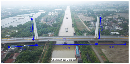 The Gengcun Dou Bridge is located in Huzhou, Zhejiang Province, China, on the Changxing–Lvshan route (X220). The primary structure is a dual-tower, single-pylon cable-stayed concrete bridge featuring a single plane of prestressed cables. The approach sections on either side comprise continuous five-span prestressed concrete box-girder bridges with uniform cross-sectional profiles. The total length of the bridge is 608.25 m, whose structural form is shown in Figure 4. The stay cables are arranged in a fan pattern, with eight pairs of stay cables on each side of the main tower, totaling sixty-four cables. The stay cables on the beam are located in the central divider, with a tower cable spacing of 2.6 m and a cable plane distance of 1.32 m. The PESM 7-187 cable system is used for the Gengcun Dou Bridge, with a cable diameter of 95.7 mm. The main girder of the bridge is designed as a triangular box structure, composed of a top plate and bottom plate, inclined webs and vertical webs, cantilever plates, and transverse diaphragms forming three chambers. The clear width at the top of the main girder is 32.5 m, and the clear width at the bottom is 4 m, with each component varying in thickness. The detailed features of the stayed cables are presented in Table 2.