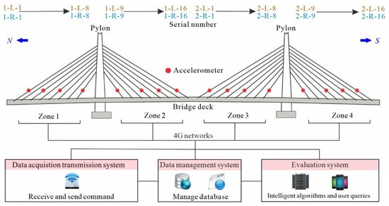 The Gengcun Dou Bridge is equipped with a structural health monitoring system as shown in Figure 5. A total of 32 accelerometers were used to measure the lateral acceleration of the cables. The accelerometers were installed approximately 3 m above the bridge deck to monitor the internal force changes in the cables during the service stage. Considering the convenience of installing the monitoring equipment and the symmetry of the structure, the entire bridge was divided into four sensing areas (Zone 1~4). Each area is fitted with eight accelerometers, which are used for measuring the cable force. The structural monitoring data is transmitted to an on-site base station through routing nodes. Upon completion of each data collection task, all acquired monitoring data are transmitted to the cloud platform using a 4 G network. This information is then synchronized in real-time at the monitoring center and subsequently displayed.