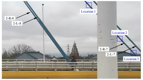 To validate the effectiveness and accuracy of the proposed measurement method, the research team conducted on-site measurements on 11 December 2023, using portable cameras to measure four cables on the south side of the bridge. The serial numbers of the cables are 2-R-8, 2-R-7, 2-L-8, and 2-L-7. The serial numbers and positions of the four cables are shown in Figure 6.