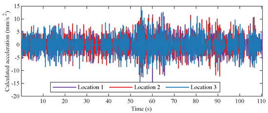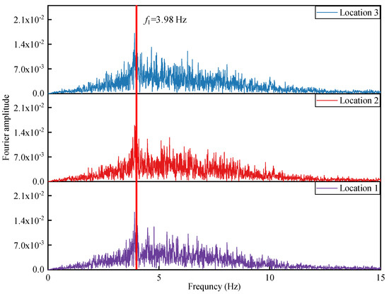 Furthermore, acceleration time histories of the cables from different locations were extracted to verify the applicability of the proposed method. Taking 2-R-6 as an example, the three selected locations are marked with blue boxes in Figure 6. The time history of displacements in these three locations was extracted. Using the computational procedure in Section 2.3, the lateral accelerations of the cables at the three positions were calculated as shown in Figure 9. The amplitude changes of the accelerations at the three positions are consistent. A Fourier transform was performed on the accelerations from the three different locations, producing the frequency spectrums as shown in Figure 10. Since the video frame rate is 30 Hz, the frequency content is restricted to 15 Hz. It can be seen that the characteristics of the three frequency spectra are consistent, effectively identifying the first-order natural frequency of the cable as 3.98 Hz. This finding validates the effectiveness of the proposed method in precisely determining the natural frequency of the cable’s lateral vibrations and in identifying its key frequency-domain characteristics. Consequently, the method demonstrates its capability to reliably extract the natural frequency associated with the cable’s lateral movement. During the measurement process, an appropriate region of interest (ROI) can be selected by considering the interaction between the environmental background and the target object, which is the foundation for the next step of calculating the cable force based on the frequency method.