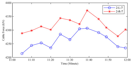 The results indicate that the cable forces, as measured using the proposed method, align closely with the results acquired from the monitoring system. Specifically, the average relative deviation remained within a 3.0% range, while the maximum relative deviation did not surpass 4.0%. The main reasons for the deviations stem from differences in the identification of the cable natural frequencies. This discrepancy primarily arises from sunlight in the bridge environment, which differentially illuminates the cable’s upper and lower surfaces. Consequently, this leads to higher grayscale values on the upper surface and lower values on the underside. This phenomenon leads to reduced precision in grayscale-image edge detection, thereby affecting the accuracy of dynamic displacement identification. Furthermore, by analyzing the video footage captured from 10:00 to 11:00 on 11 December 2023, the time histories of the cable forces for cables 2-L-7 and 2-R-7 are plotted in Figure 11. The figure reveals that the trends in cable-force changes for the two symmetric cables are essentially consistent, demonstrating that the method proposed in this paper can effectively measure the trend of cable-force variations in large-span bridges.