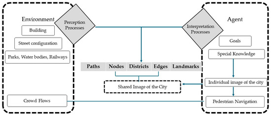- Filomena, G.; Manley, E.; Verstegen, J.A. Perception of urban subdivisions in pedestrian movement simulation. PLoS ONE 2020, 15, e0244099. [Google Scholar] [CrossRef]