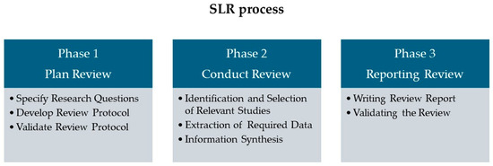 The philosophy for developing this SLR was adopted from a previous study (Kitchenham et al., 2002) [37]. There are three phases to the research process. The initial planning phase addresses defining research topics, designing, and verifying review methods. The discovery and selection of relevant research, data extraction, and the information synthesis process are addressed in the second step. Writing and validating the SLR falls in the third phase. The flow of the three stages is depicted in Figure 6.