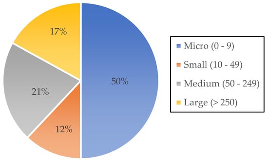 The results of the statistical analysis regarding the characteristics of questionnaire participants are presented. The figures below describe aspects such as organisation size, the organisation’s primary activities, and participants’ roles within their companies. As observed in Figure 2, the majority of participants work in micro-businesses (50%), followed by small (12%) and medium-sized organisations (21%). Lastly, participants from large organisations contribute to 17% of the total. In 2021, the vast majority of construction enterprises in Italy were micro-sized companies (95%) with zero to nine employees [43].
