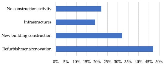 Figure 3 illustrates the primary construction activities identified by the participants. Renovation and refurbishment are the most common activities, with 47% of participants involved. New building construction is also significant, with 32% of participants engaged in this activity. Approximately 14% of participants are linked to infrastructure projects. Finally, around 22% of participants are not associated with a specific construction activity. These participants may be involved with public or private developers whose main activities differ from construction, or they may be engaged in consultancy work.