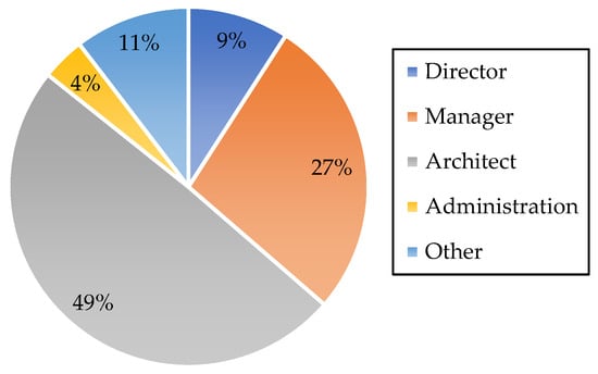 Figure 4 illustrates the roles participants hold within their organisations, providing insight into their decision-making and capacity for change. A significant portion, 49%, are involved specifically in architectural design. Following this, 27% of participants hold managerial roles, and 11% are directors. A small portion, 4%, are in administrative roles. Additionally, 11% of participants fall under the ‘others’ category, which includes consultancy and other unique positions. Notably, there is a substantial representation of participants with high-level decision-making capacity, including directors and managers (36%). This diversity of roles among the participants offers valuable insights into the dynamics of their organisations and potential opportunities for change and improvement.