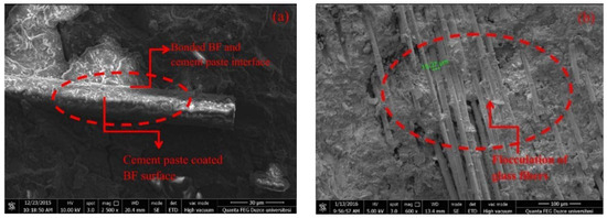 Numerous studies have been conducted to characterise the microstructure/microstructural gradients of the ITZ in concrete using different tools, such as scanning electron microscopy (SEM) and energy-dispersive X-rays (EDXs) [31]. From the SEM images [16] in Figure 3a, a well-bonded, partially coated ITZ between the BFs and paste is visible, which contributes to increased flexural and splitting tensile strengths. Furthermore, it was observed that the high tensile strength of BFs could be the reason for the fibre rupture restriction. The glass fibres (Figure 3b), on the other hand, exhibited agglomeration tendencies, suggesting the need for careful production to prevent agglomeration in glass fibre-reinforced concrete mixtures. No agglomeration was observed in the BF-reinforced concrete mixtures [16].