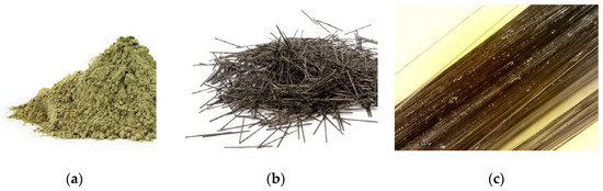 The coated–chopped composite BFs from Deutsche Basalt Faser GmbH have a rectangular cross-section with average dimensions of 0.55 mm to 0.36 mm and are composed of filaments with a diameter of 13 ± 1 μm, a length of 24 mm, and a density of 1.9 g/cm3. The properties of the OSA and BFs are presented in Figure 4.