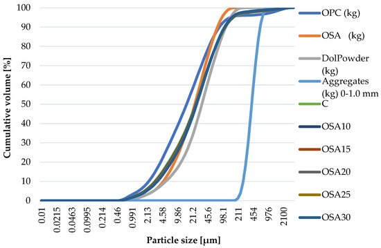 The proportions of PLC and OSA change in relation to the particle size distribution (PSD) of the individual mixes. The suitable proportion of individual materials can influence the packing density, and therefore, the PSDs of the individual powder materials, except microsilica, were analysed, and the grading curves are provided in Figure 5. Figure 5 shows that with increasing content of OSA, the overall PSD of the individual mixes changes only slightly. Since OSA shows a PSD of a similar order of magnitude as cement, it is expected that it would directly replace cement in terms of particle packing.