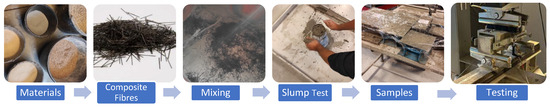 The flow of the experimental work is shown in Figure 6. The mixing of concrete was carried out in a tilting drum mixer. The required materials were pre-weighted as per mix proportion and mixed as follows: (1) half of the cement, powders, and aggregates were dry mixed; (2) half of the water was poured into the mixer; (3) the remaining cement, powders, and aggregates were added; (4) the remaining water and SP were then added to reach the targeted workability; and (5) BFs were spread into the rotating mixer so that a uniform distribution of fibres was achieved. The fresh concrete’s consistency was measured by a slump test with a target slump of 220–250 mm. The concrete was cast into moulds and, after 24 h of initial curing under cover, moved to the water storage tank. Compressive and flexural strengths were evaluated on the 28-day-old samples. To understand the fibre–paste ITZ of the concrete, a microstructural analysis was conducted using SEM.