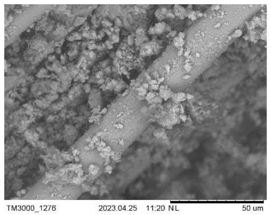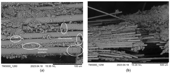 The SEM images in Figure 7 show that several basalt filaments are embedded in the concrete matrix, and it seems that the resin of the BFs is disrupted. Each individual BF has its own ITZ surrounding it [2,42], with the diameter of each BF’s own ITZ being difficult to determine. Nonetheless, the individual ITZs of the fibres contribute to the overall fibre–paste ITZ network by combining and overlapping with each other. When the destruction of the paste begins due to external loading, the fibres provide strength to the paste to a certain extent. The SEM sample is cut out of a larger sample with the aim of having the BFs visible on the analysed surface. Some fibres can fracture due to the sample preparation, as can be observed in Figure 7. Furthermore, there are visible gaps between fibres where neither the resin nor cementitious paste penetrated and poorly formed binder hydration products between and around the individual basalt filaments.