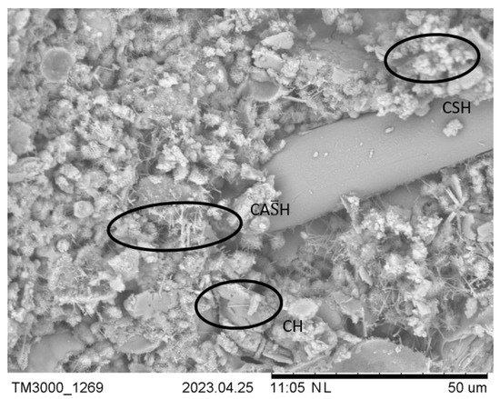High-density CSH is predominantly present in the bulk paste, and low-density CSH with a larger distance between layers filled with water molecules is likely to be present in the ITZs. Additional CSH is formed by the reaction between the alkaline binder and silicates from the BFs that are not sufficiently coated by the macro-BF resin. The BF surface indicates some level of interaction and chemical bonding between the fibres and the paste [46], leading to improved fibre–paste interface properties. It should be noted that the CSH products on the surface of the BFs could be attributed to a phenomenon called secondary deposition or precipitation. Secondary deposition may occur if the silica-rich BFs lose their coating and are directly exposed to the alkaline environment of the cement paste, instigating a reaction which results in the formation of a thin layer of CSH on the fibre surface [47,48,49]. The described phenomena can be observed in the SEM image in Figure 9. However, if the reaction continues, it could completely degrade the BFs and compromise the benefits of BF application [50].