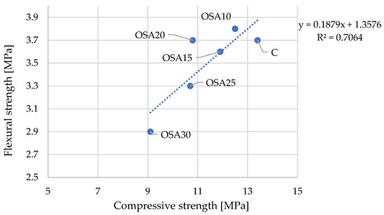 The results of the compressive and flexural strength tests are presented in Table 3 and Figure 10. The flexural strength of the tested concretes with a constant BF dose showed stable performance for up to 20% OSA replacement. Higher replacement ratios led to a significant reduction in the flexural strength by 21.6% in the case of OSA30; see Figure 10.