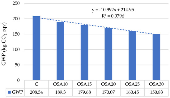 Since OSA is a waste material, its environmental impact is quantified to show its additional benefits. OSA significantly reduced the carbon footprint of the prepared mixes, as shown in Figure 11. The global warming potential (GWP) was calculated for the individual mixes without fibres to prove the positive impact. For the calculation, the Norwegian platform for the Environmental Product Declaration (EPD) calculation provided by LCA.no [51] was used, considering only raw materials (Section A1). It can be observed in Figure 6 how the carbon footprint decreases with the replacement of PLC with OSA in the concrete mix.