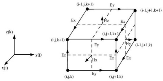 Maxwell’s equations, the fundamental equations of electromagnetic theory, describe the relationship between electric and magnetic fields, charge density, and current density. They represent the basic propagation laws that electromagnetic waves follow [21]. The discretized formulas for Maxwell’s equations are shown as Equations (1)–(4).