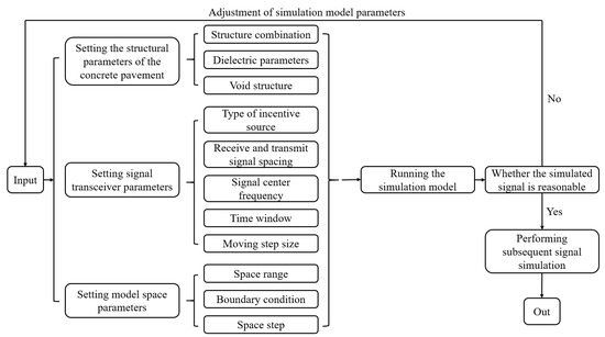 The modeling process involves writing input files in GprMax to set the spatial, structural, and signal parameters of the numerical simulation model. Based on the numerical simulation results regarding the response of void conditions, signal parameters are optimized to meet the accuracy requirements of the numerical simulation. Following this, data collection and processing are performed on the output ‘out’ file. The specific detailed process is shown in Figure 2.