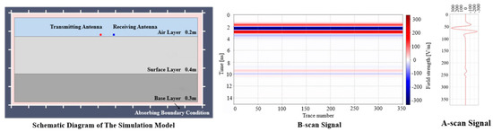 After running the numerical simulation model, the obtained GPR echo signals, as depicted on the right side of Figure 3, demonstrate the behavior of the electromagnetic waves. Initially, at the interface of the air layer and the surface layer, there is a reflection resulting in a direct wave reflected from the surface, characterized by strong energy and a short time delay. Similarly, at the interface of the surface and the base layer, another reflection occurs, presenting a weaker energy compared to the direct wave. The A-scan signal vividly exhibits the signal fluctuations caused by the changes in the medium at the air–surface and surface–base layer interfaces. Additionally, the B-scan signal displays the mapping relationship between the distribution of pavement structural layers and the corresponding strength and time delay of the echo signals. This verifies the rationality of parameters such as frequency, sampling interval, and time window set in the numerical simulation model.