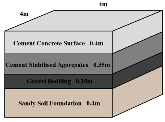 Following the airport pavement structure design specifications, a precast void test site was set up with a pavement structure of four 4 m × 4 m panels. Each panel comprised a 40 cm thick cement concrete surface layer, a 35 cm thick cement-stabilized crushed stone base layer, a 25 cm thick crushed stone cushion layer, and a 50 cm thick sand subbase, as schematically shown in Figure 4. The actual void areas were created using a mixture of air and loose fine aggregate. Consequently, the void structures in the precast test site were represented by elongated plastic plates with dielectric properties similar to the actual void material. Two void conditions were introduced underground in the GPR test line: void condition one measured 845 mm × 325 mm × 40 mm, while void condition two measured 545 mm × 200 mm × 15 mm.