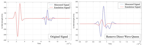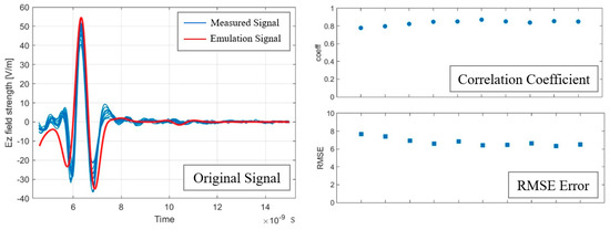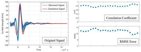 The comparative diagrams between the measured signal samples and simulated signals are shown on the left side of Figure 5 and Figure 6. To further quantify the correlation between the two sets, two metrics were employed: the correlation coefficient [23] and the root mean square error [24]. The calculation formulas are as per Equations (19) and (20), and the computed results are shown on the right side of Figure 5 and Figure 6.