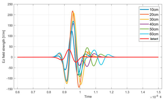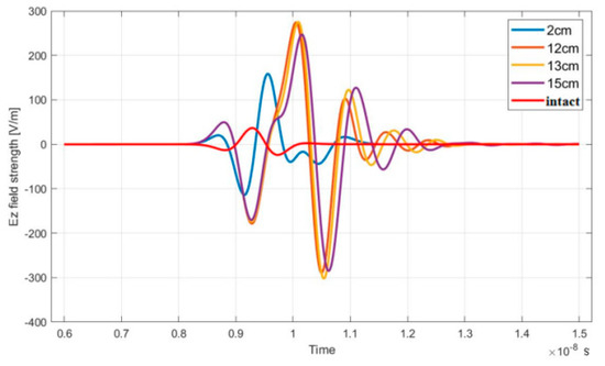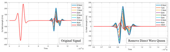 From Figure 7, it is evident that the direct wave signal at 2 ns remains consistent in its timing and amplitude regardless of the differences between the void and intact structures. This signal, referred to as the ground direct wave, maintains a consistent waveform with “short delay, strong energy” characteristics [25], primarily due to the proximity of the transmission antenna to the ground and the high proportion of the transmission signal’s energy represented by the direct wave. When using ground-penetrating radar for underground target detection, the ground direct wave can interfere with the return echo signal of the detection target. This requires suppression techniques based on signal analysis and the characteristics of the ground direct wave, commonly employing algorithms such as time-domain thresholding, windowing, de-meaning, independent component analysis, etc.