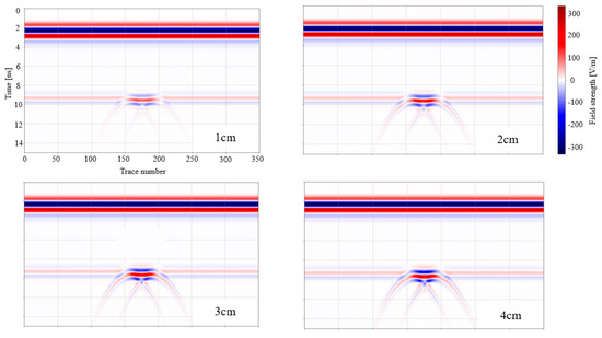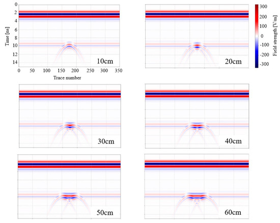 Moreover, the vertical resolution of GPR, referring to the minimum thickness of a structure resolved by the receiving end in the time domain, typically stands at λ/4, with the ultimate limit being λ/8 [26]. For an 800 MHz GPR system with a wavelength (λ) of about 0.375 m, the resolution equates to approximately 10 cm. Therefore, for void thicknesses less than 10 cm, the reflected signal in terms of phase, time delay, and amplitude remains indistinguishable. However, for void thicknesses exceeding 10 cm, as shown in Figure 11, the reflected signals exhibit significant differences in terms of phase, time delay, and amplitude. Actual void thicknesses in voids under airport pavements are typically within 10 cm, smaller than the vertical resolution of GPR. This renders it possible to rely on the amplitude intensity of the A-scan signal and the brightness in the B-scan signal to assess the thickness of the void.