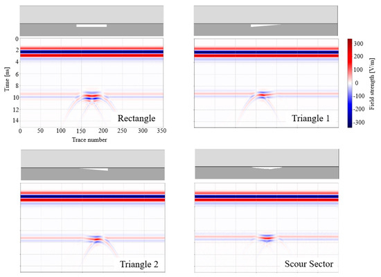 In summary, the influence of different void shapes on GPR echo signals is more evident in the differences in void thickness at different measurement points. Overall, the characteristics of various void shapes, such as color block area highlighting, alternating positive–negative amplitude, and continuous same-phase axis, are similar to the rectangular void shape, while slight differences correspond to the thickness change trends of the void shape.