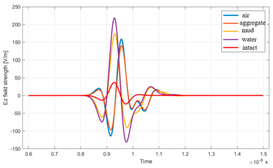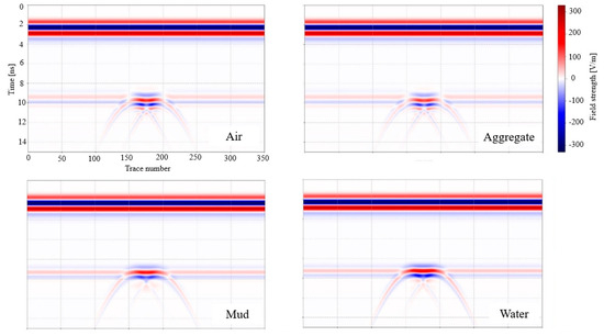 The properties of the void-filling medium in the void space are influenced by factors such as pavement structural strength, aircraft loading frequency, rainfall, temperature, etc. These factors lead to varying dielectric characteristics in different stages of void development, consequently affecting the echo signal morphology of the void structure. Therefore, within the numerical simulation model, four different void-filling media are established to investigate the influence of various void-filling media on the morphology of echo signals. The dielectric characteristics of each medium and the simulated scenarios are presented in Table 4 [28,29].