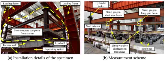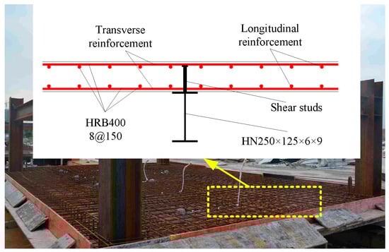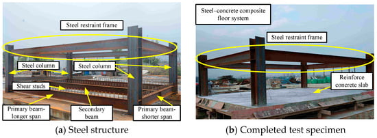 30], full-scale specimen of steel–concrete composite slabs were designed. The specimen simulated the real boundary conditions of the SCCFS in actual steel–concrete composite structures, such as the slab being supported on the steel primary beams of the steel frame and connecting them with shear studs. The test model of the SCCFS is shown in
