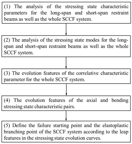 Structural stressing state theory is a science used to study the general working characteristics of structures based on the natural law from quantitative change to qualitative change in a system. Modeling and analyzing structural test and simulation data can reveal structural failure starting points and structural elastoplastic branching points, which could result in the precise structural design, safety assessment, and risk early warning. To model and analyze the structural stressing state, it is generally necessary to convert structural response data (such as strains and displacements) into state variables. The state variables are then used to construct stressing state modes and characteristic parameters, called the stressing state characteristic pair. Subsequently, the evolution curves of the stressing state characteristic parameters are examined to identify the leap points. The stressing state mode evolution curves are then inspected to verify the leap features. The leap points reveal the failure starting point and elastoplastic branching point of the SCCFS.
