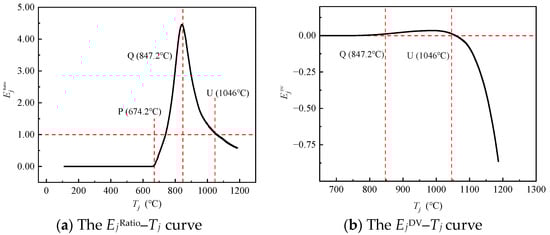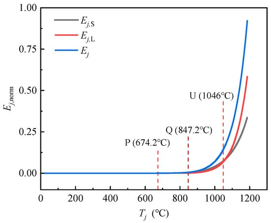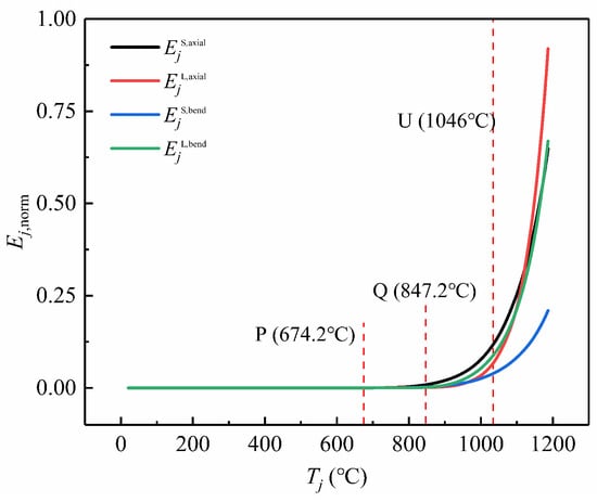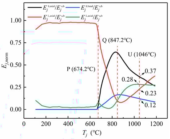 When the temperature reaches point U, all the curves have a more significant transitional feature and rise rapidly. Specifically, EjL,axial and EjL,bend show the fastest growth trend and reach a large value, while the trend of EjS,bend grows slower. These features reflect that the strain energy along the long-span direction accumulates significantly more than that along the short-span direction, which also illustrates the evolution of the stressing state mode.