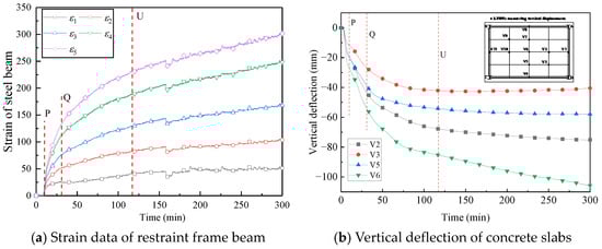 During the fire test, composite floor slabs exhibited warping deformation at the corners. Therefore, the internal forces of composite floor slabs are transmitted to the steel beams and steel columns in the steel restraint frame. To measure the axial forces and bending moment in the steel beams, five strain gauge measurement points are set at the mid-span of the steel beams, with data collected every 5 s. Prior to ignition, all initial values measured by the strain gauges were set to zero simultaneously.