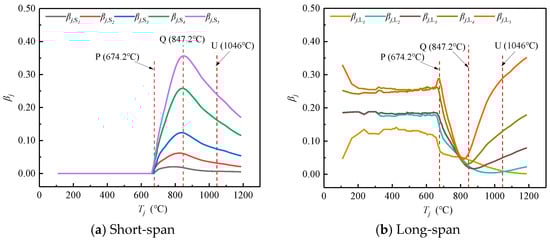 TQ = 847.2 °C), where a transformation occurs and begins to decrease gradually. When the temperature is located at the interval between points Q and U, although the curve shows a downward trend rapidly, the characteristic parameter value of the long-span steel beam remains greater than that of the short-span steel beam during this phase. When the temperature exceeds the progressive failure point U (