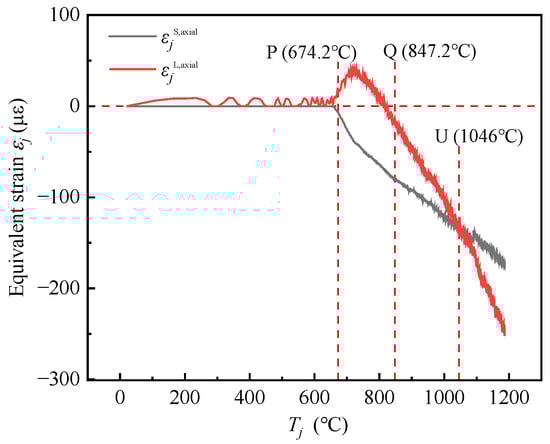 It can be seen that before point P, the value of εjS, axial is basically unchanged, and εjL, axial shows a fluctuating change. In a word, there is no significant change generally. When the temperature exceeds 674.2 °C, the equivalent strain εjL, axial at the long-span direction showed a growth trend and then decreased (always tensile strain), while the strain εjS, axial in the short-span direction gradually increased and showed a compressive strain. This is mainly due to the expansion deformation in the long-span direction being more obvious than that in the short-span direction, which makes the cross-section of the long-span beam show a tensile force state.