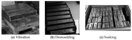 where represents the compressive strength (MPa), F represents the load at failure (N), and A represents the compressed area (mm2). The strength values measured using non-standard specimens (100 mm × 100 mm × 100 mm) should be multiplied by a size conversion factor of 0.95 in GB/T 50081-2019 [].