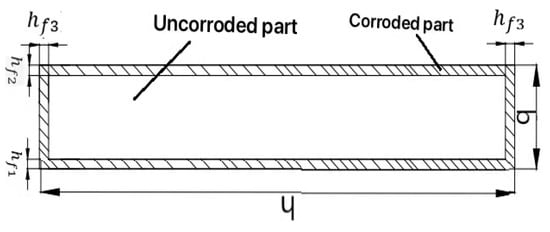 where represents the surface damage due to ASR; represents the cross-sectional area of the concrete before ASR; represents the initial cross-sectional area of the concrete when ASR begins; b and h represent the width and height of the concrete specimen, respectively; , , and represent the thickness of the corrosion damage layer on the top, bottom, and side surfaces of the concrete, respectively.