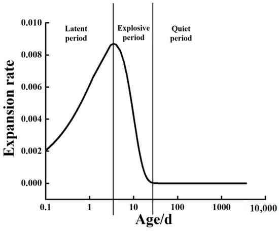 The expansion rate reaches its peak between 5 and 7 days of soaking, a phase termed the “latent period”, characterized by a short duration and a concave development pattern. After peaking, the expansion rate begins to decline, eventually approaching a near-zero minimum, marking this as the “explosive period”, which exhibits a convex development. Once the minimal expansion rate is achieved, the “quiescent period” follows, which lasts longer and is characterized by a nearly horizontal trajectory, indicating a slope that is close to zero. Thus, the expansion rate development curve is divided into three distinct phases: concave development during the latent period, convex development during the explosive period, and an overall S-shaped progression. Consequently, this study refers to the KAMJ model as the “flattened S-curve model”.
