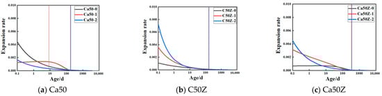 The development of expansion rate under long-term immersion in standard alkaline solution at 38 °C. (a) Ca50; (b) C50Z; (c) Ca50Z.