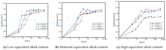 Figure 4 demonstrates that under long-term immersion in a standard alkali solution at 38 °C, HPC exhibits virtually no latent period and directly transitions into the explosive phase. This is attributed to the questionable alkali reactivity of the fine aggregates used in this study, along with the higher equivalent alkali content in the moderate and high alkali states of HPC, which causes the material to skip the latent period and enter the explosive phase at the onset of immersion. With the increase in the equivalent alkali content, the initial expansion rate also rises, suggesting that a higher alkali content accelerates the development rate of HPC expansion. However, the duration of the explosive phase remains consistent across different equivalent alkali contents at the same strength grade, indicating that the end timing of the explosive phase is not significantly influenced by the internal equivalent alkali content of the concrete.
